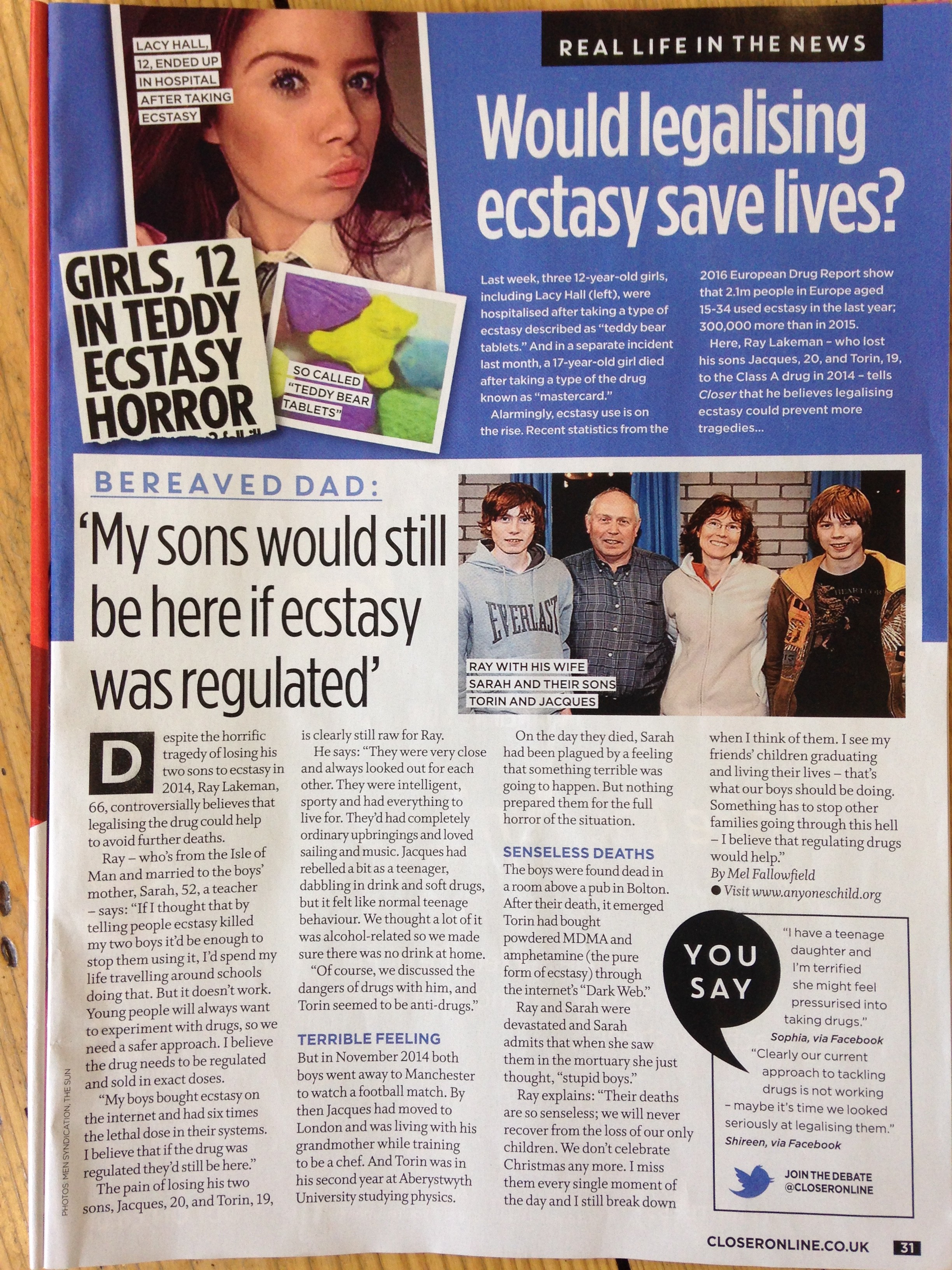 “My life ended when I lost my two sons Torin and Jacques so unexpectedly in one night. I never wanted to join a group like Anyone’s Child – but having lost everything, I feel that it’s all I can do now – to try and stop others from having to go through what I’ve been through- and for me that means campaigning for the legal control and regulation of drugs.” Ray Lakeman, who lost both his sons to ecstasy overdoses.